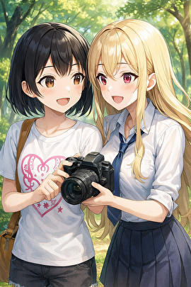 念願の一眼レフカメラを手に入れた海夢に、光画部(写真部)OGのさんごが使い方の手ほどきをしているところ。