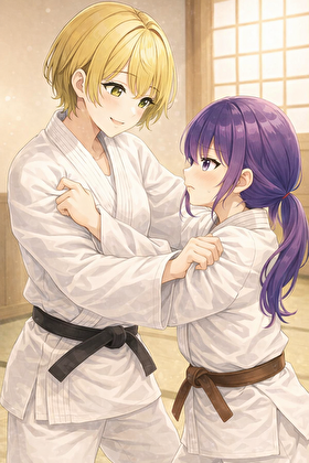 チエ先生がカヤちゃんに柔道の稽古をつけてあげている。