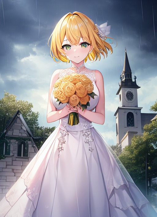 暴風雨の中、ウェディングドレス姿で教会の前にたたずむ姿。